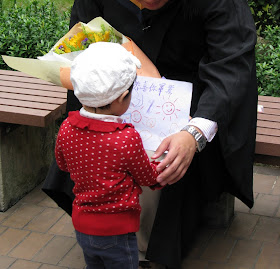 首先大公主向我送上一紮鮮花與一張她親手畫的圖畫,賀伯伯畢業。當然,圖畫上的文字不是她所寫啦!