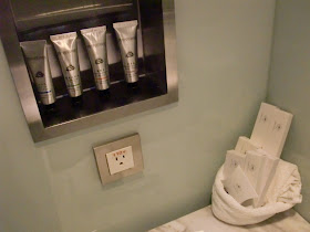 玻璃門一道之後就係洗手間,你有眼見,四枝包括沐浴露洗頭水護髮素與及潤膚霜都擺得型過人,仲有一件手製茉莉花肥皂;另一道玻璃門之後就係沐浴間,有兩款花灑,仲能夠望出睡房,勁!