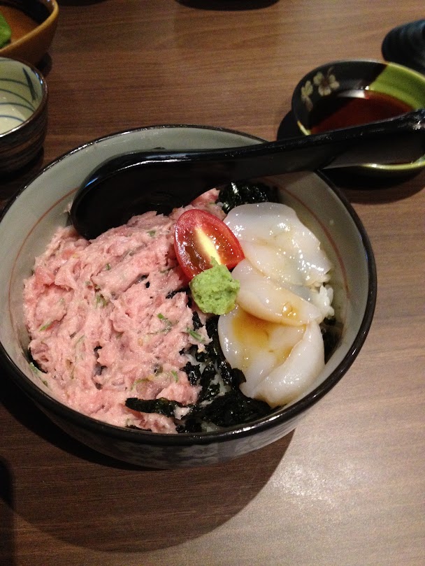 星期日,與住附近朋友約食飯,諗住試試佢。十二點鐘,無乜人,入去坐定定,睇睇午市定食餐牌。我見魚生飯方面帆立貝前面唔知點解硬係加上山葵兩個字,問經理佢解極我都唔明,又唔係加左入去,咁碗碗魚生飯都有Pat Wasabi架啦,你講乜呢阿Sir?