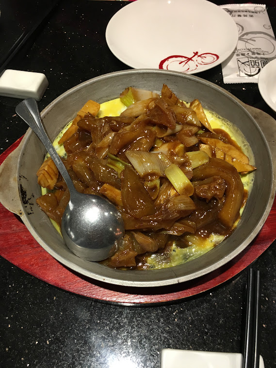 蔥燒牛筋,鐵窩上,果然上海菜偏甜,牛筋好鬆化濃味,窩底淋上蛋液,令整道菜無咁油膩。