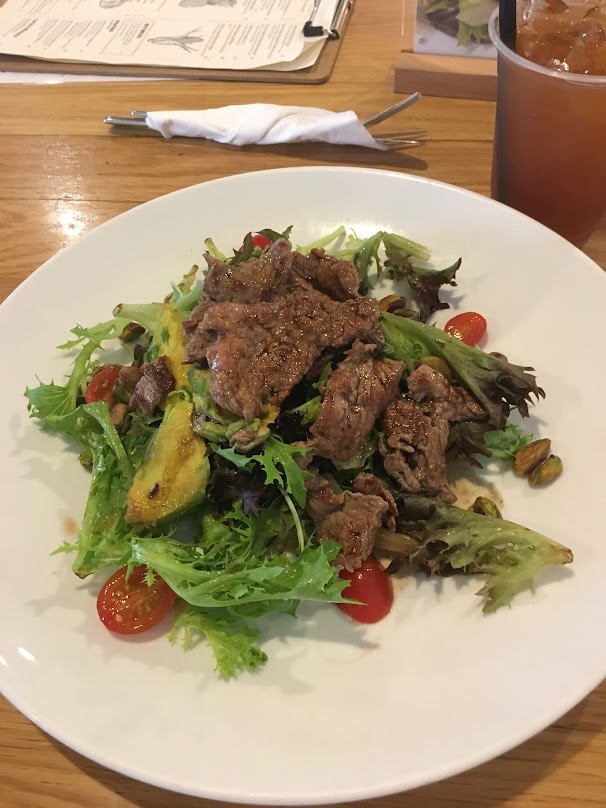 牛柳沙律,牛柳Juicy原味,沙律先係重點:紅酒醋加欖油,火箭菜開心果牛油果Cherry Tomatoes,配合得天衣無縫!