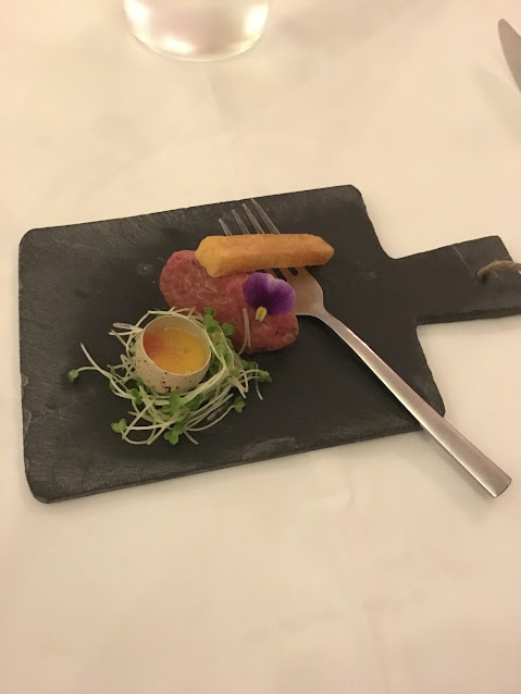 我沒有想過我的Amuse Bouche會是牛肉他他配上鵪鶉蛋!牛肉他他鮮甜而且調味到位,混上蛋汁,用炸麵包條一嘗,啊!極之高質啊!之後還配上酥餅,我已經覺得,這家店應該驚喜連連了!