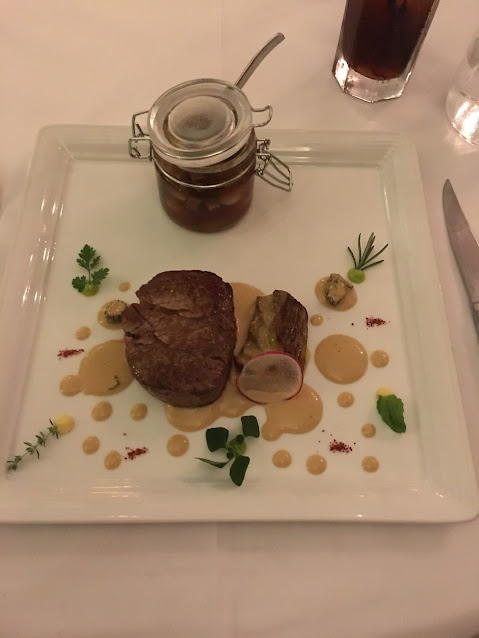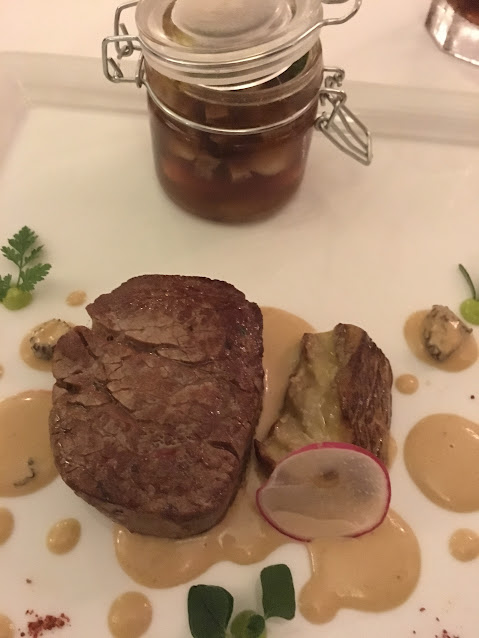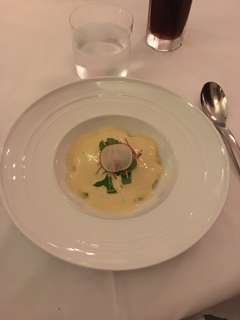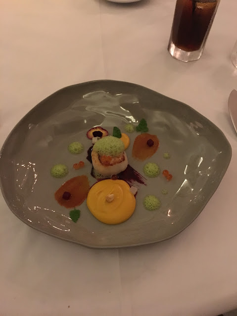 吃法國菜是要有耐性的,而且要欣賞享受食物,所以等了一會兒出現的這道菜,一上檯,視覺已經滿分!這是什麼呢?鮮帶子略略調味然後煎至表面至金黃色,內裡仍然鮮嫩,配上蘿蔔汁,紅菜頭汁,菠菜泡沫,三文魚籽,可食用的花,薄荷葉,每一口配上不同的食材,都讓人回味無窮,完全是視覺味覺都非常高分的食物,真的可以慢慢享受。