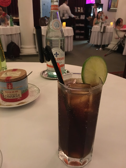 哪理旁邊的在慶祝生日,這位食客一樣吃得很快樂,還高高興興地品酒。說回我好了,選了一個五道菜的晚餐,沒有點餐酒(我要計住數食嘛),點了一杯Long Island,另外有一瓶礦泉水。