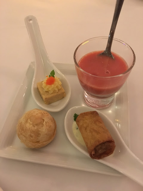 這應該是我的套餐前奉上的,已經讓人充滿期待:右上角的是蕃茄凍湯,然後右下是羊肉法式春卷,精緻而且味道極捧!左下的是用煙肉芝士菇類製成慕絲的小泡芙,一口吃掉很回味,左上的是fish cake加上魚籽,侍應沒有告訴我是什麼,但感覺是吞拿魚吧。