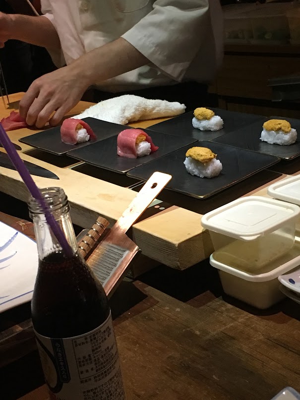 瞞著爹,位於該處有幾間舖頭,有熱食居酒屋,有香港人好愛既丼飯店,而此Omakase店有上下兩層,下層對著師傅約有十二個位,閣樓有兩張約每張可坐六位客人小桌子,基本上食客都要除鞋才可進入餐廳。午市的Omakase一律NTD1,680再加一。