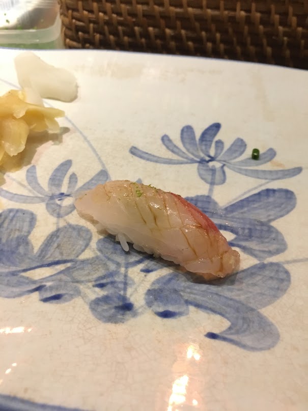 之前有竹筴魚壽司,但唔記得左影,台灣好多竹筴魚,日本人喜歡用作炮製一夜干。而呢個係紅喉魚壽司,經過輕炙,味道偏淡。