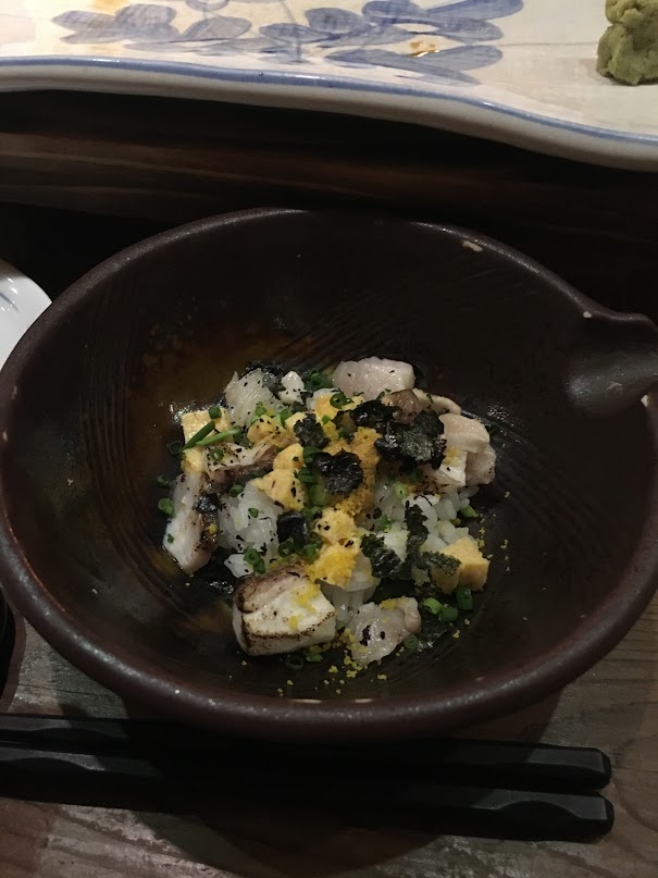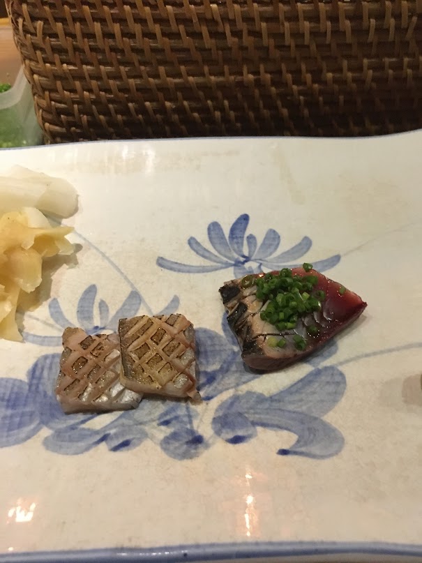 左邊兩片係經過輕炙既肉魚(我係後來再上網查,先知道肉魚即係刺鯧),與及右邊係鯖魚。不錯不錯。但後來有另一批台灣客人到場,此兩款份量又唔同,邊左一片肉魚兩片鯖魚。