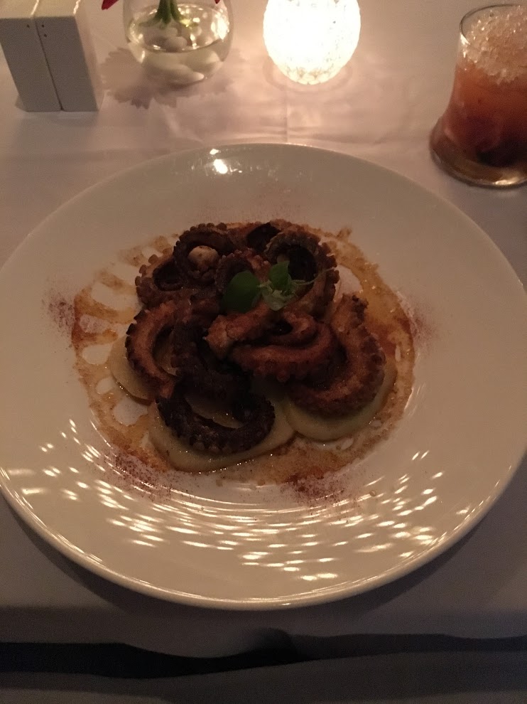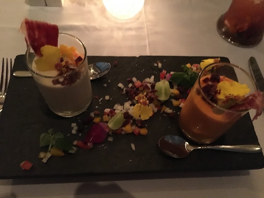 由於餐廳期間限定推西班牙菜,呢個凍湯叫Salmorejo & Ajoblanco,前者乃西班牙蕃茄凍湯,後者乃西班牙白蒜凍湯,配上廿四個月西班牙風乾火腿,中間所有伴碟蔬菜花朵與及火腿粒都食得,好喜歡!九十元港紙左右。