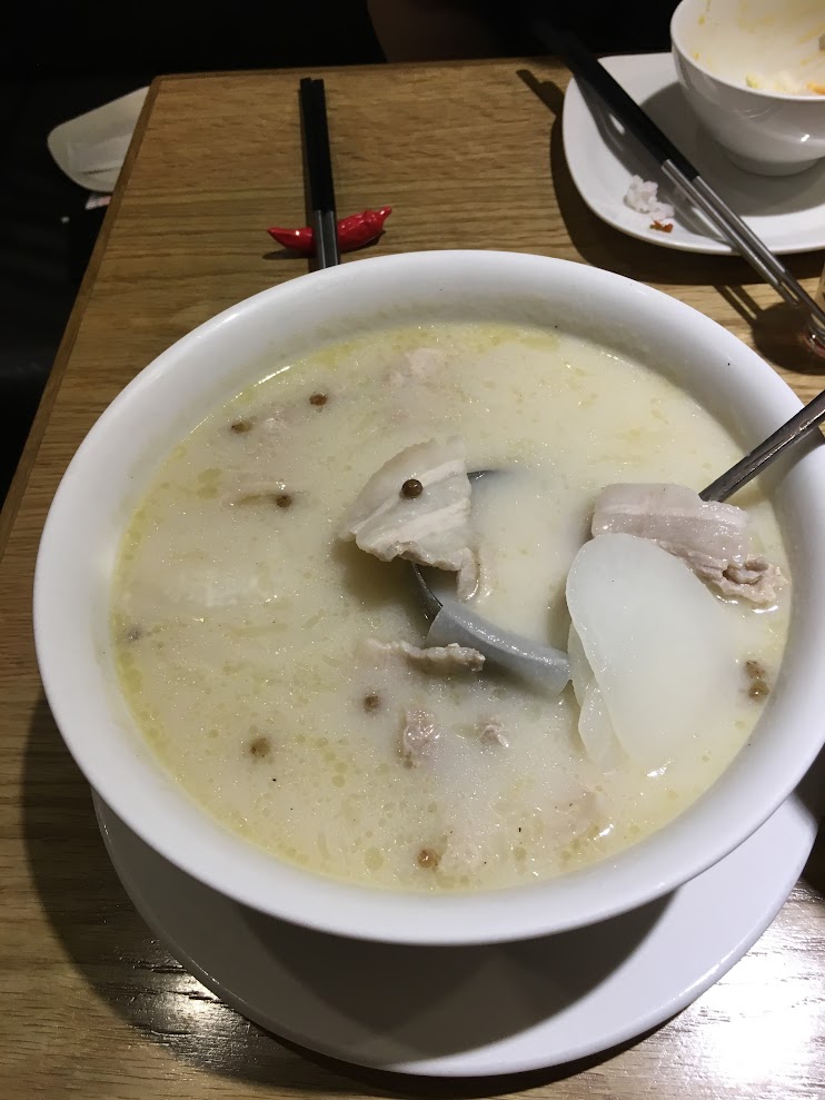 另外點了一個唔刺激既湯水,連鍋湯,用上豬骨餚湯配上五花腩肉,白蘿蔔與胡椒粒,清甜好飲,我叫朋友打包番屋企!