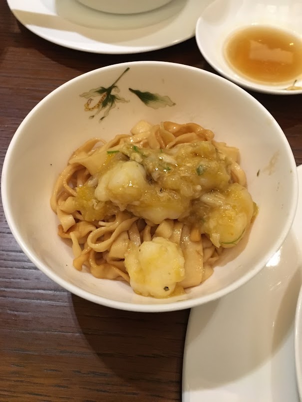 另外點了蔥油拌麵,麵是人工手打的,充滿蛋香而且有咬口,本身已經好好食,若果將蟹粉蝦仁撈埋一齊,啊!極品極品!