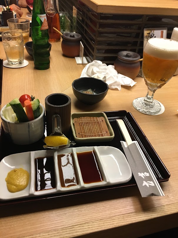 蔬菜免費(不過第一轉之後再俾你既只有菜,但非常新鮮爽脆),第二幅相較遠在餐牌旁係用水裝住既芫茜,原來又係俾客人隨便食架播!我要提醒一下,此店,完全無英文Menu!我比較好運,第一,呢位師傅好努力逐串介紹係乜(雖然好多時都唔係好明),第二,我旁邊坐左對後生本地情侶,男仔英文好好,不時解釋我知食緊乜,仲有,佢話當你話ダメ(Da咩)叫師傅唔好再上俾你,你係可以從menu點番你未食到又想食既炸串。