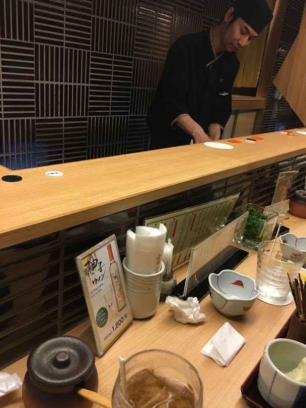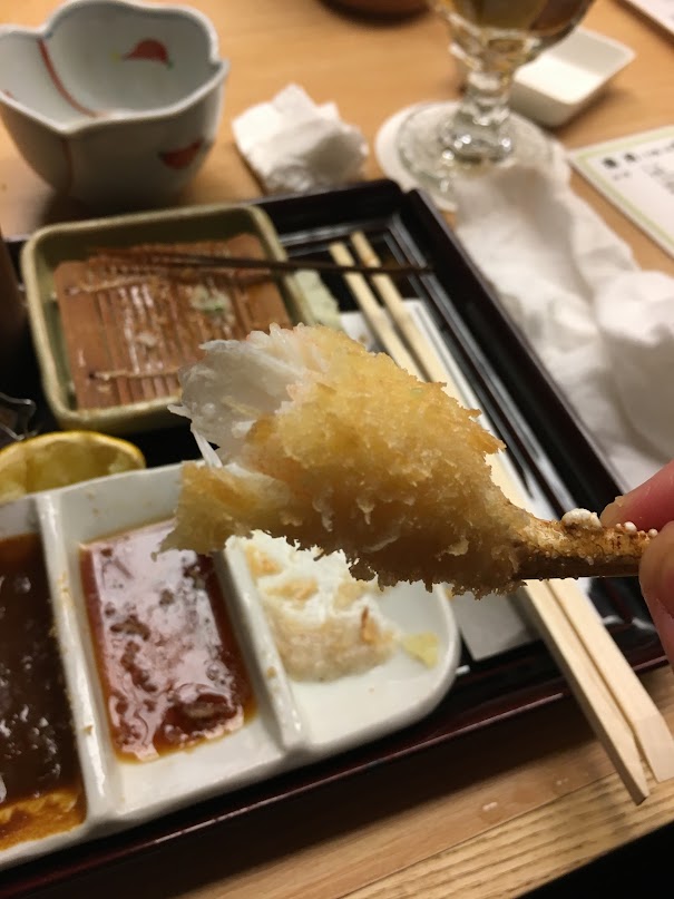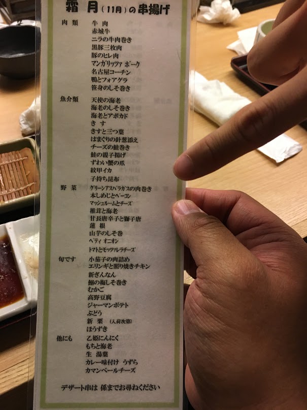 入座喇,玩法係咁:餐廳內有四個師傅主理位置,每個師傅招呼十個客人左右,師傅就密密炸逐串遞俾你食,每串180日元,食完計數。咁你會問:食乜?有冇得揀呢?坐低師傅就會問你有乜唔食,然後佢就會在你無預計之下逐串上。