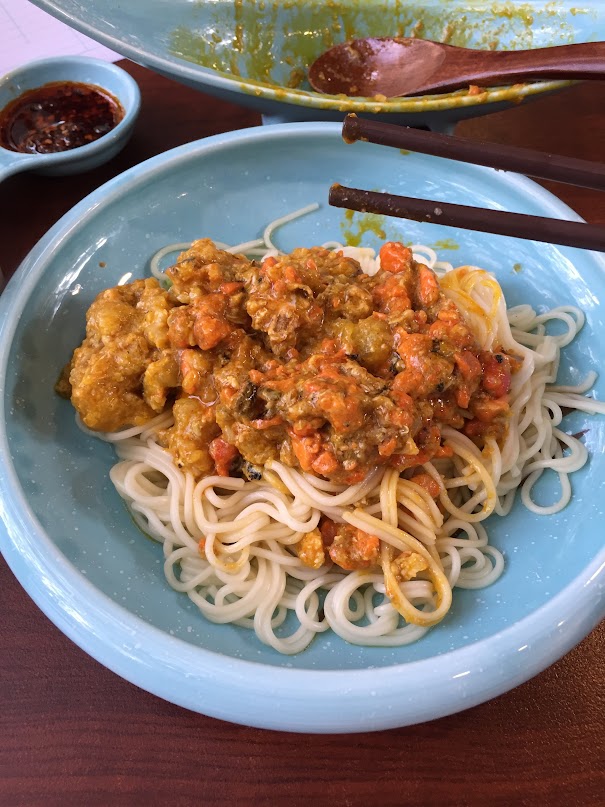 蟹膏蟹黃蟹腳蟹肉仲有唔知乜,每樣一盤,據聞飯麵可以任添,人仔六八八啦。呢位阿姐就一人前隊左呢個,豪氣非常。