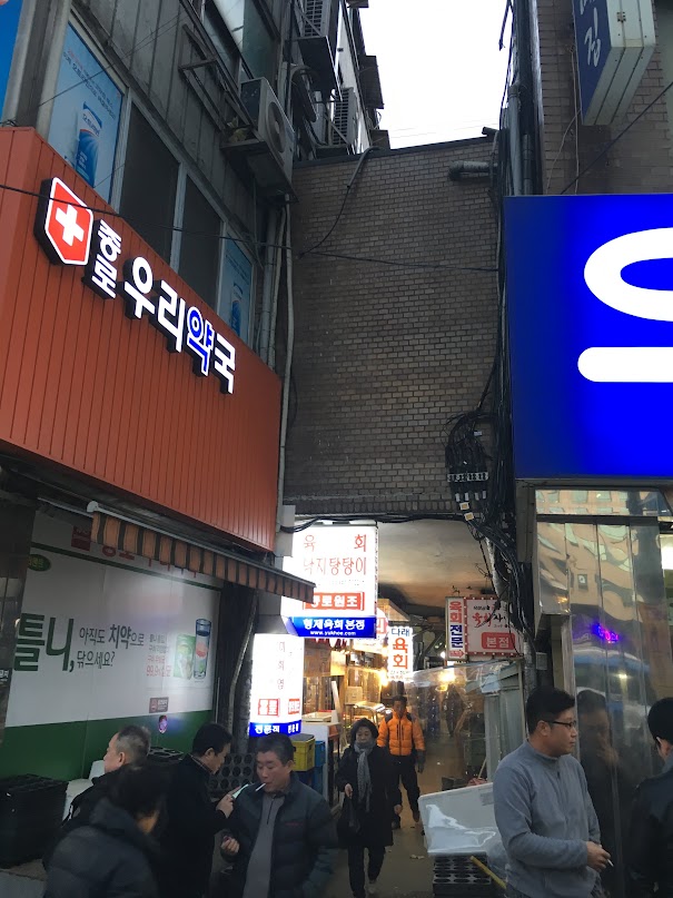 從南大門酒店出發,叫酒店人員幫我同的士司機講想去邊,然後佢載到我去附近,用手勢問我係咪食野(我估啦下)然後係某個入口放低我。一入去先發現,想搵食生牛肉果間舖並不容易,無錯,入口旁已經有餐廳,但一場黎到,無理由唔搵番果間架下話。